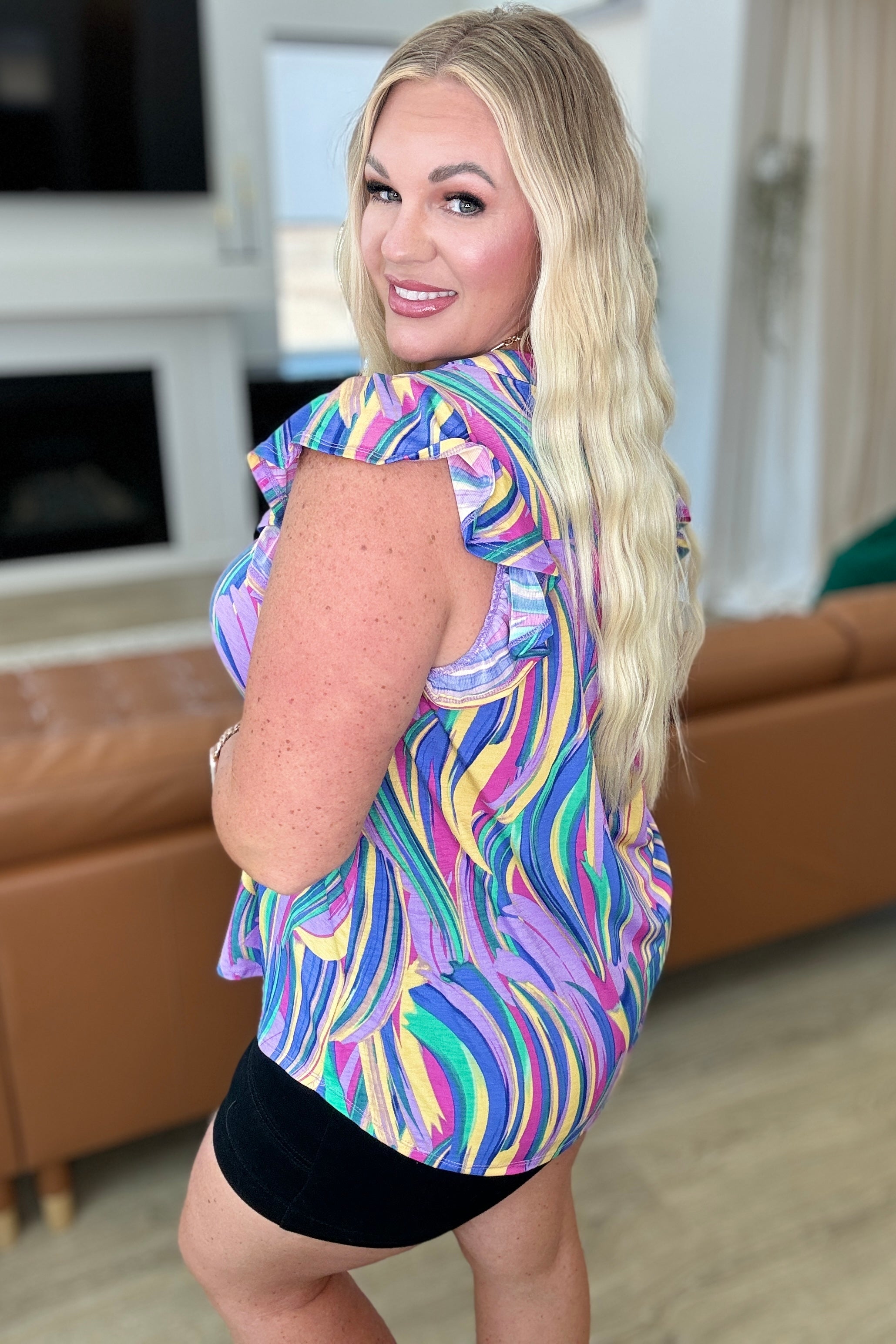 Add some flair to your wardrobe with the Lizzy Flutter Sleeve Top! This playful top features a V-neck, flutter sleeves, and a hi-low scooped hem. Perfect for any occasion, the groovy pattern adds a touch of stylish whimsy. Upgrade your style game with Bulgari's latest!
