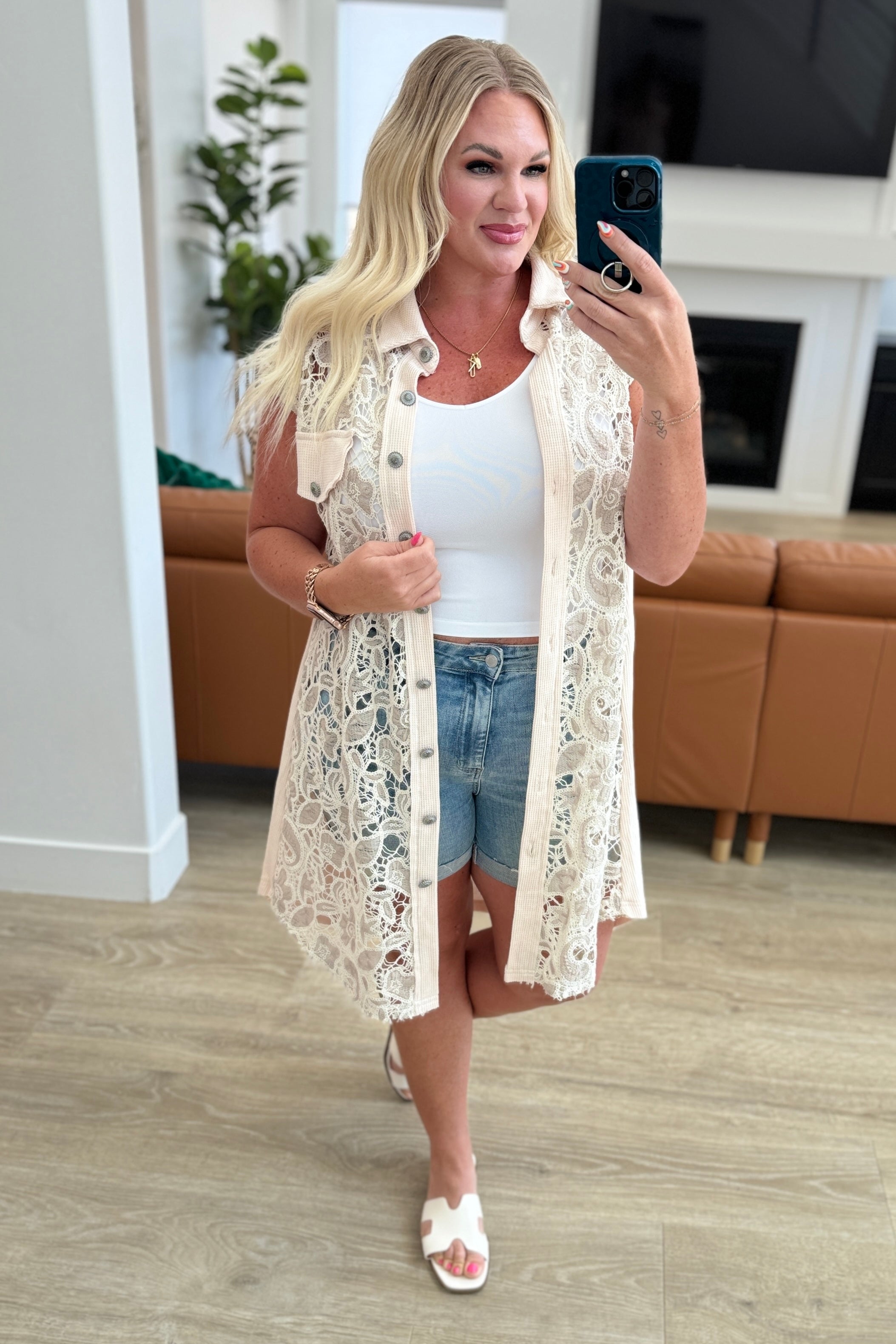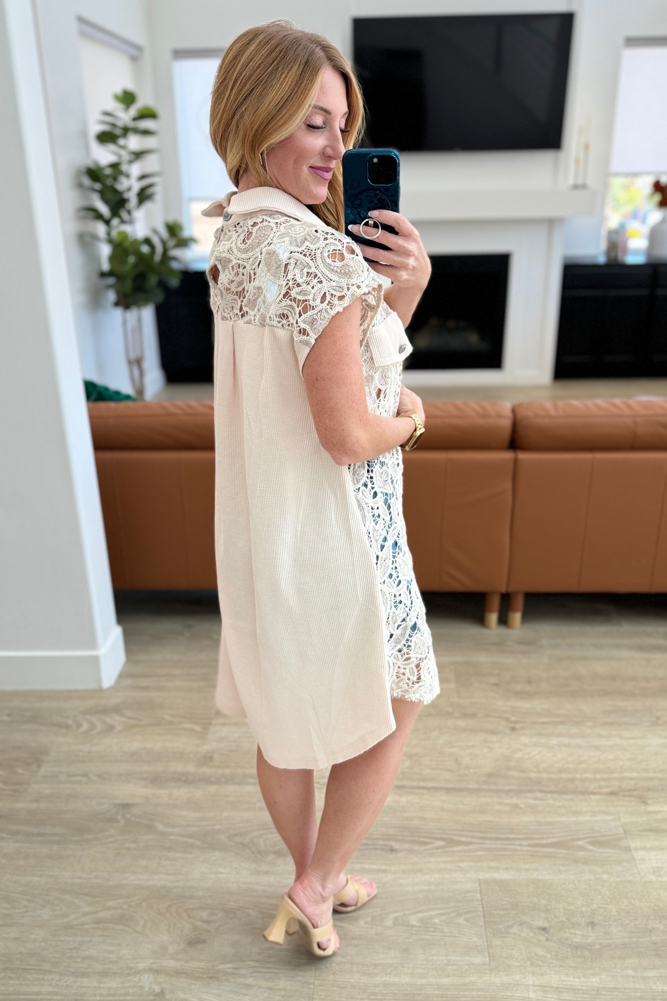 Unleash your unique self in our Pieces of Me Longline Lace Button Up. The waffle knit and lace contrast create a playful and eye-catching look. With a collared neckline, functional button closures, decorative pocket flap, scooped hem, and back pleat, this shirt is both stylish and functional.