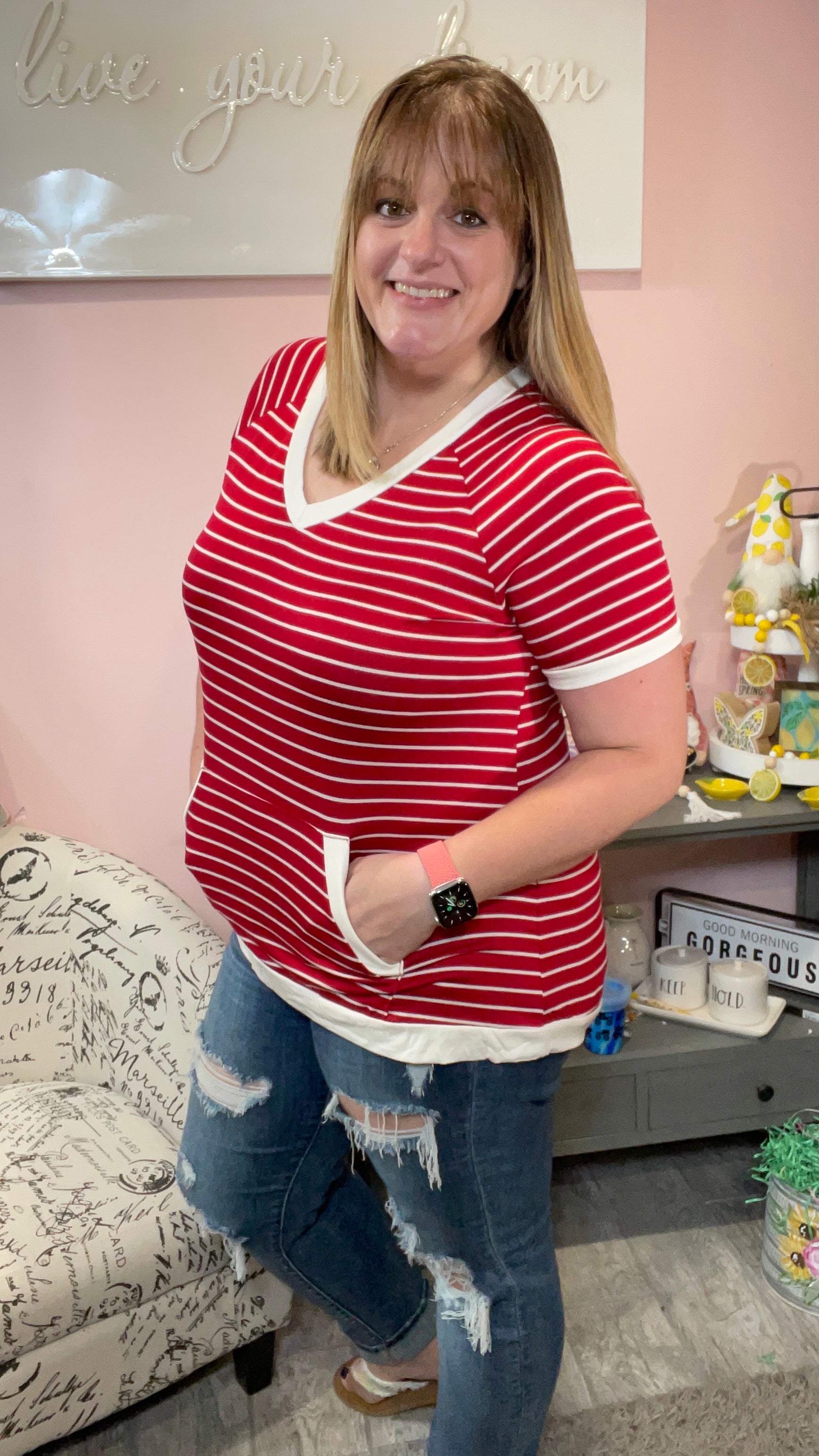 Red and Ivory Stripe Kangaroo Pocket Tee