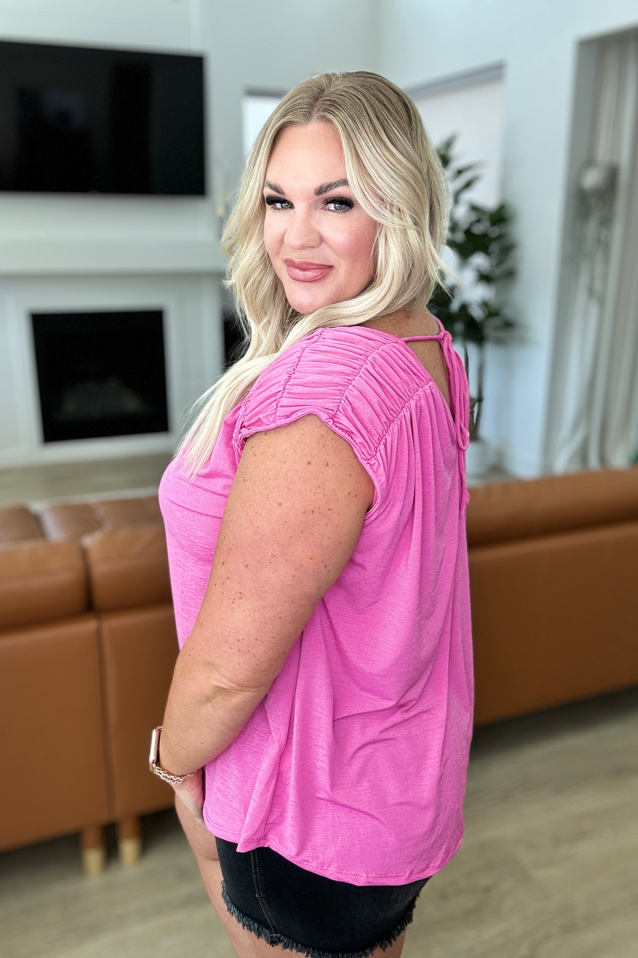 Effortlessly cool and playful, our Ruched Cap Sleeve Top is a must-have addition to your wardrobe. The gathered elastic shoulders and tie back create a relaxed fit, while the bulgari fabric keeps you cool and wrinkle-free. Perfect for a casual day out or a fun night in.