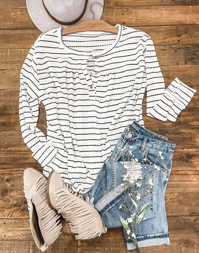 Adorable waffle stripe top! Features pleated front and back with working button neckline! So cute to pair with cardigans!