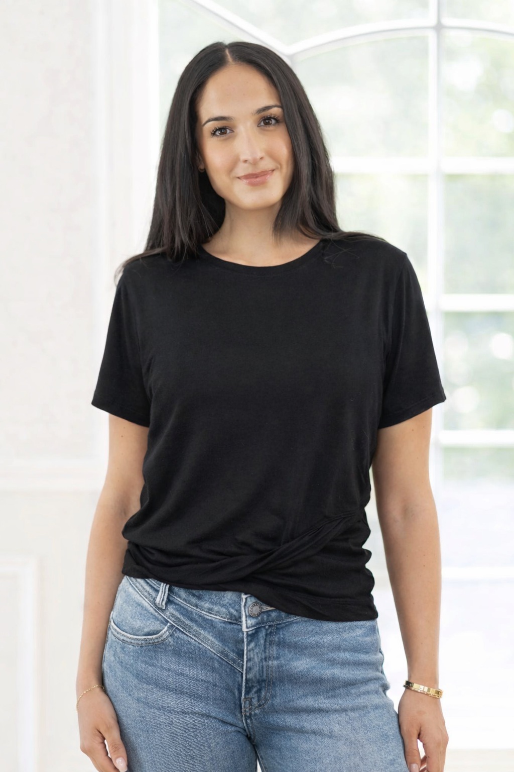 This top has everything you need (get it?) - a stylish trimming edge, cropped design, and flattering short sleeves. A versatile addition to any wardrobe, it's the perfect choice for an effortlessly cool and playful look. Say hello to your new go-to top!