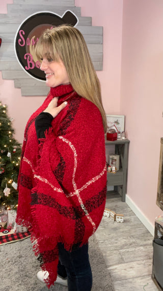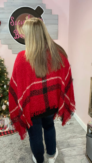 We can't get over how gorgeous this classic plaid poncho is! It features a classic plaid print, an adorable fringe detail, an asymmetrical hemline, soft knit material, and a comfy turtleneck for a fabulous fall look! Toss this stylish poncho on over a plain long sleeve top, black leggings, and classic tall boots!