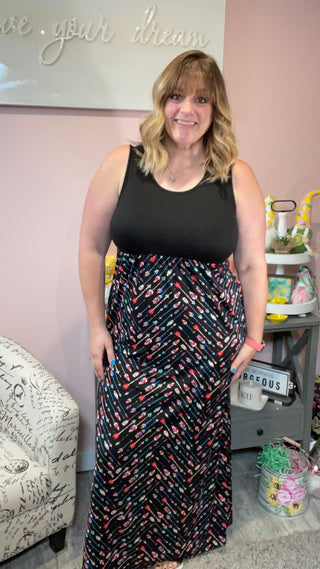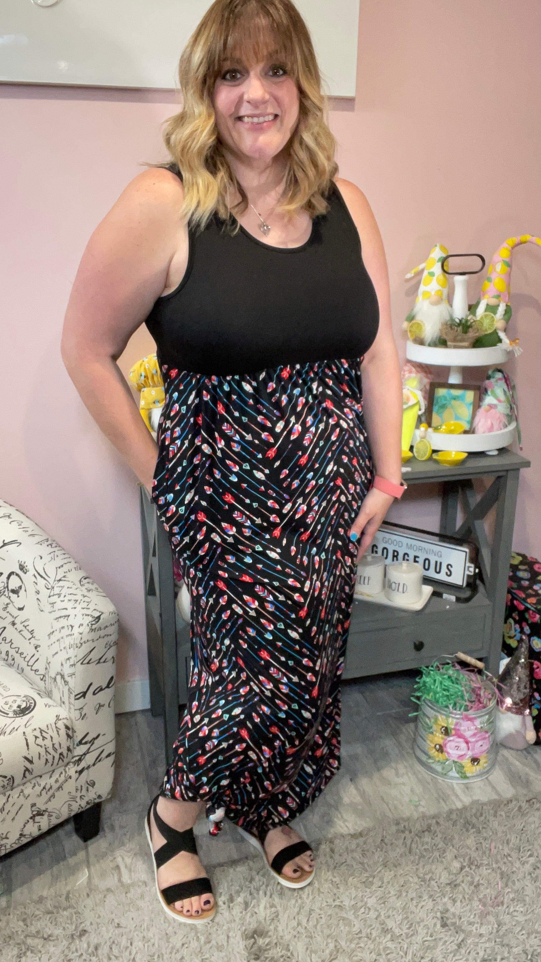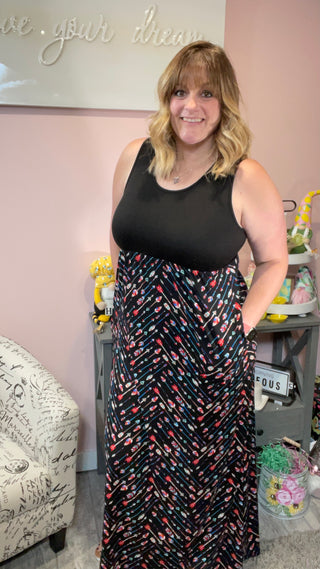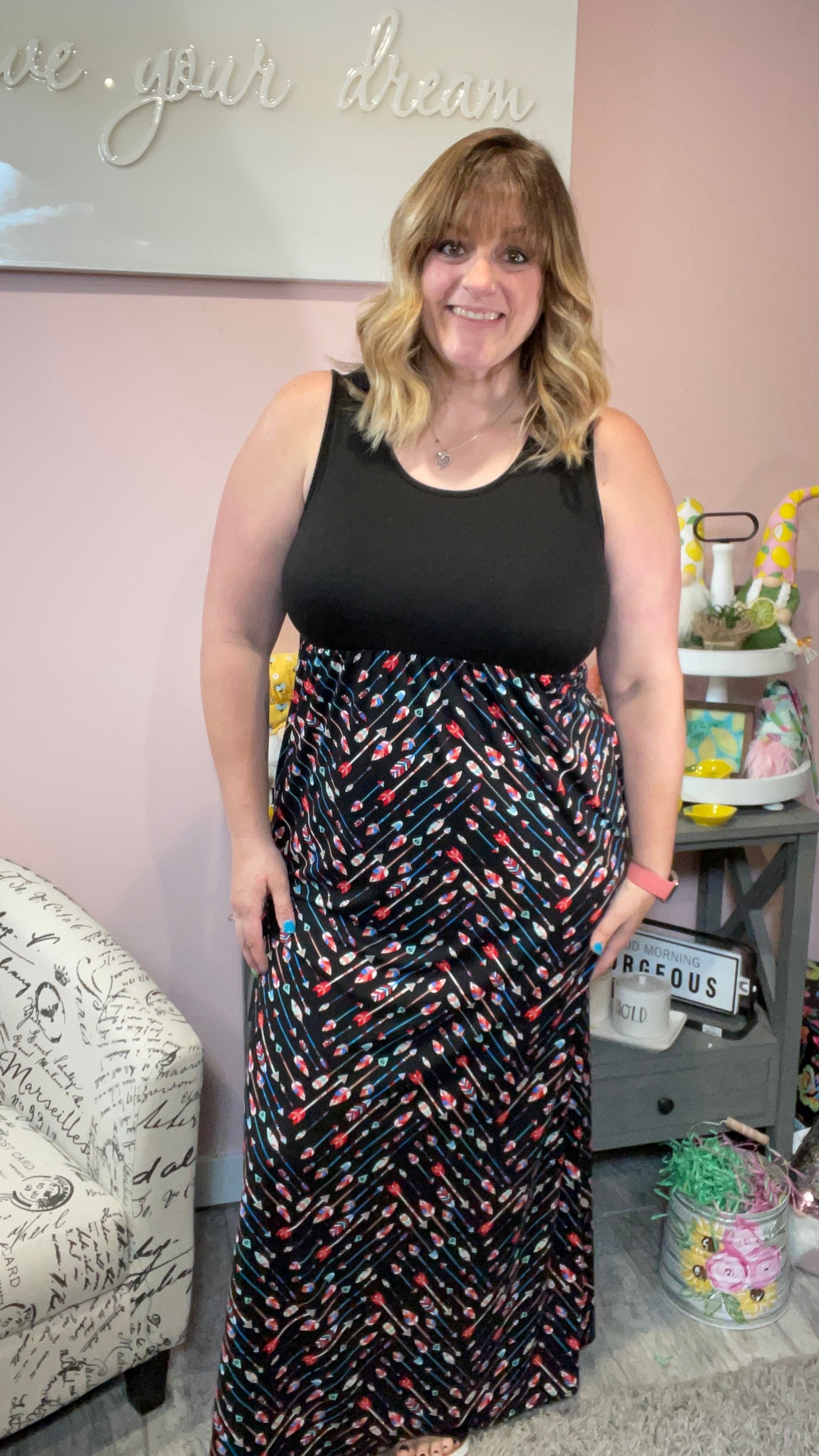 This dressing is so stunning! Classic black top, gorgeous black base with bright arrows print, and of course, POCKETS! This is the high stretch brushed fabric that you all love too!