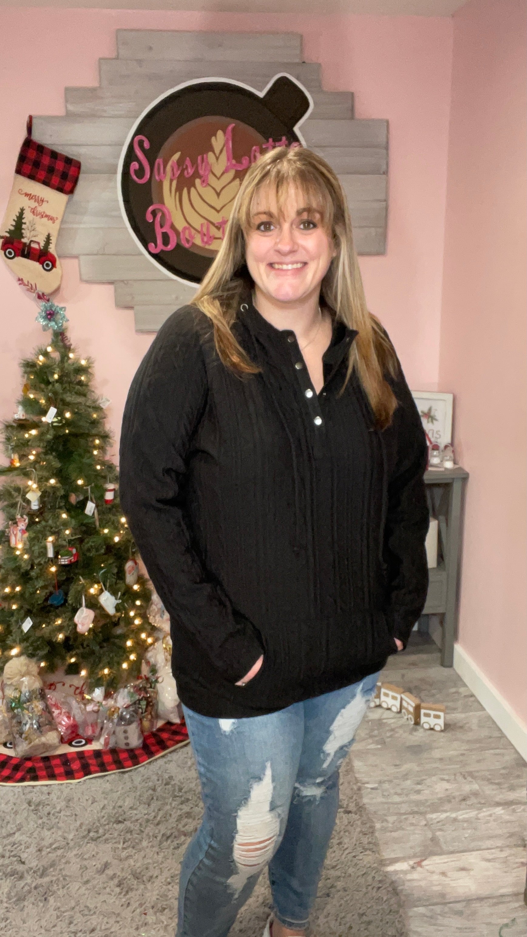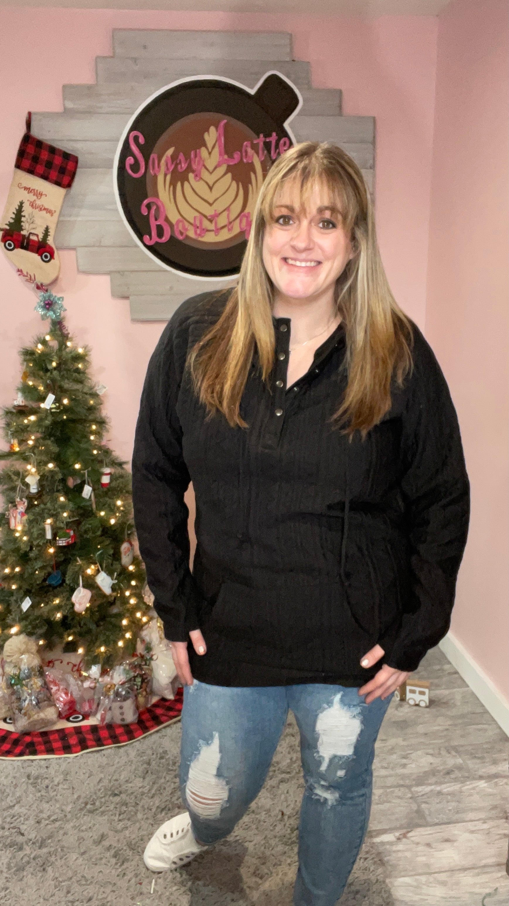 Sure to be a new favorite! Average stretch solid black fabric with super cute aztec print design! This hoodie is very soft, has a kangaroo pocket, and of course, half snaps!!
