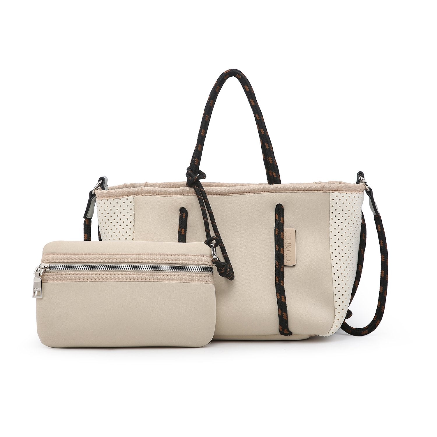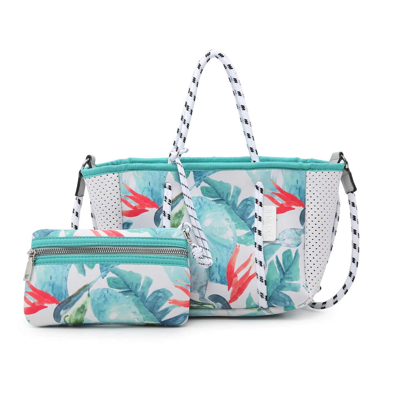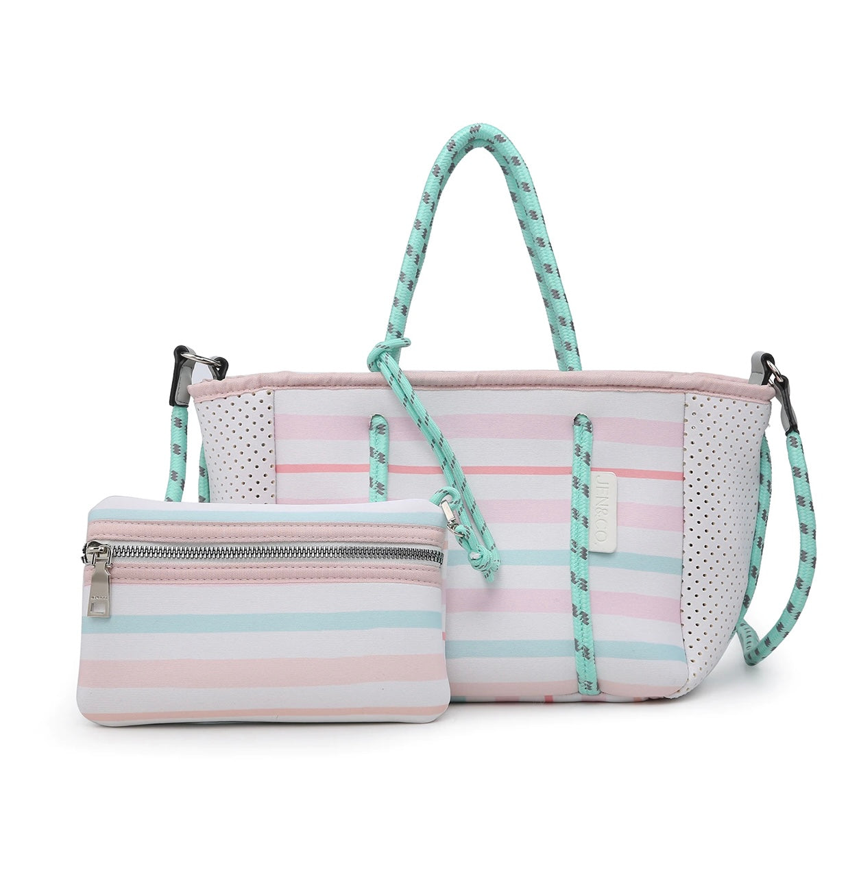 Coralia is part of our highly anticipated neoprene collection! Features durable, washable material and rope handles. Includes a small, inner zip bag that is detachable. The main bag also zips partly closed. Available in many great solid colors or patterns!
