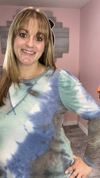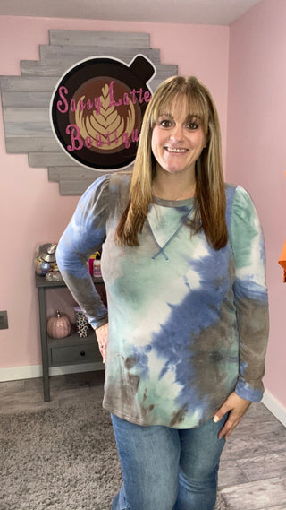 I am apparently obsessed with this color tie dye. We have it in a few different style tops, but check out how awesome this one is!! The slight puff shoulder just makes it!