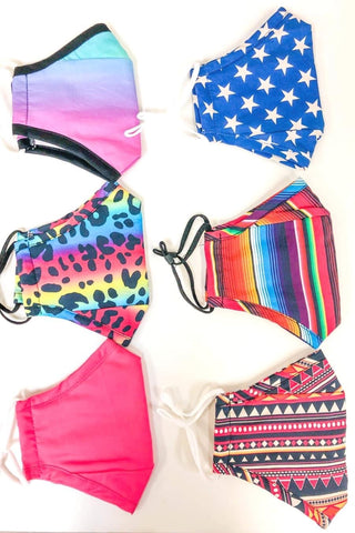 Stay healthy in style. These face masks are comfortable, compact, has low air resistance, and easy breathing and speaking. These masks are washable, reusable, and features a filter pocket. One size fits most adults.