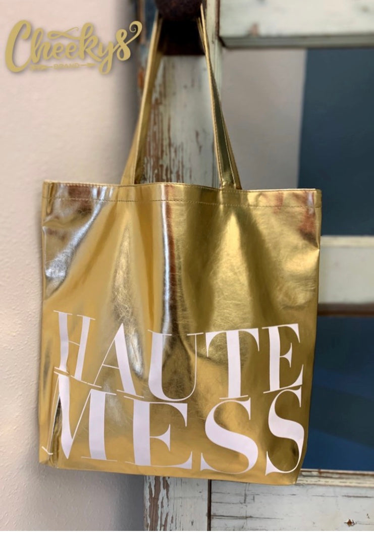 Beautiful gold tote bag measures at 16" W x 14.5" H
