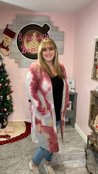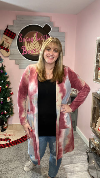 This tie dye lightweight cardigan is so cute! Pocket detail on front with open front cardigan bodice.