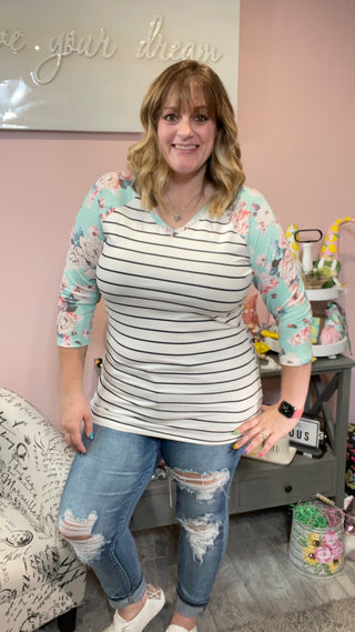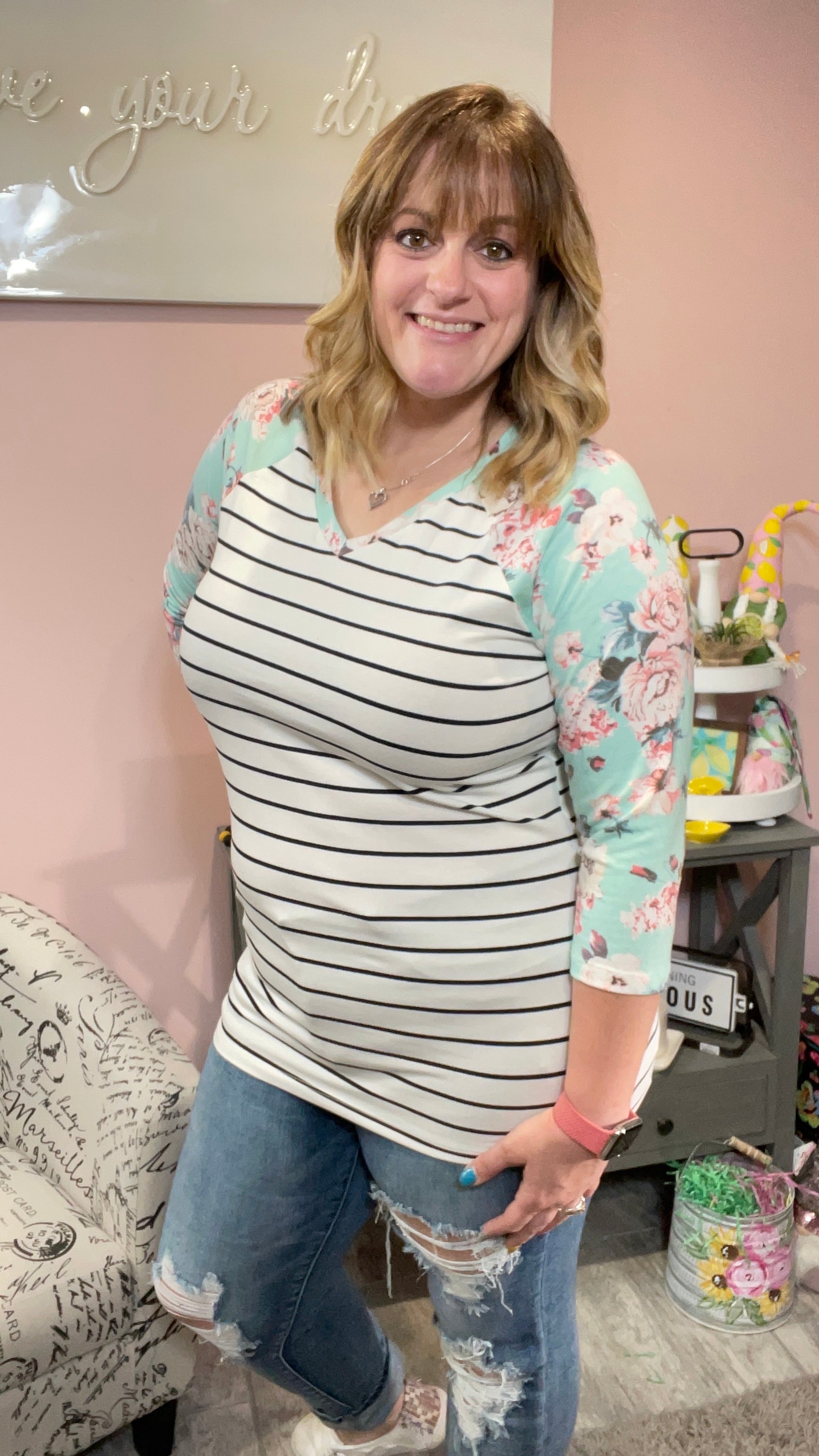Classic 3/4 sleeve with a v-neck and the perfect pattern mixing of mint floral sleeves and white with black stripes! The v-neck will be slightly deeper (more traditional v-neck) on the final versions. Runs true to size, lightweight but not sheer, and very soft!