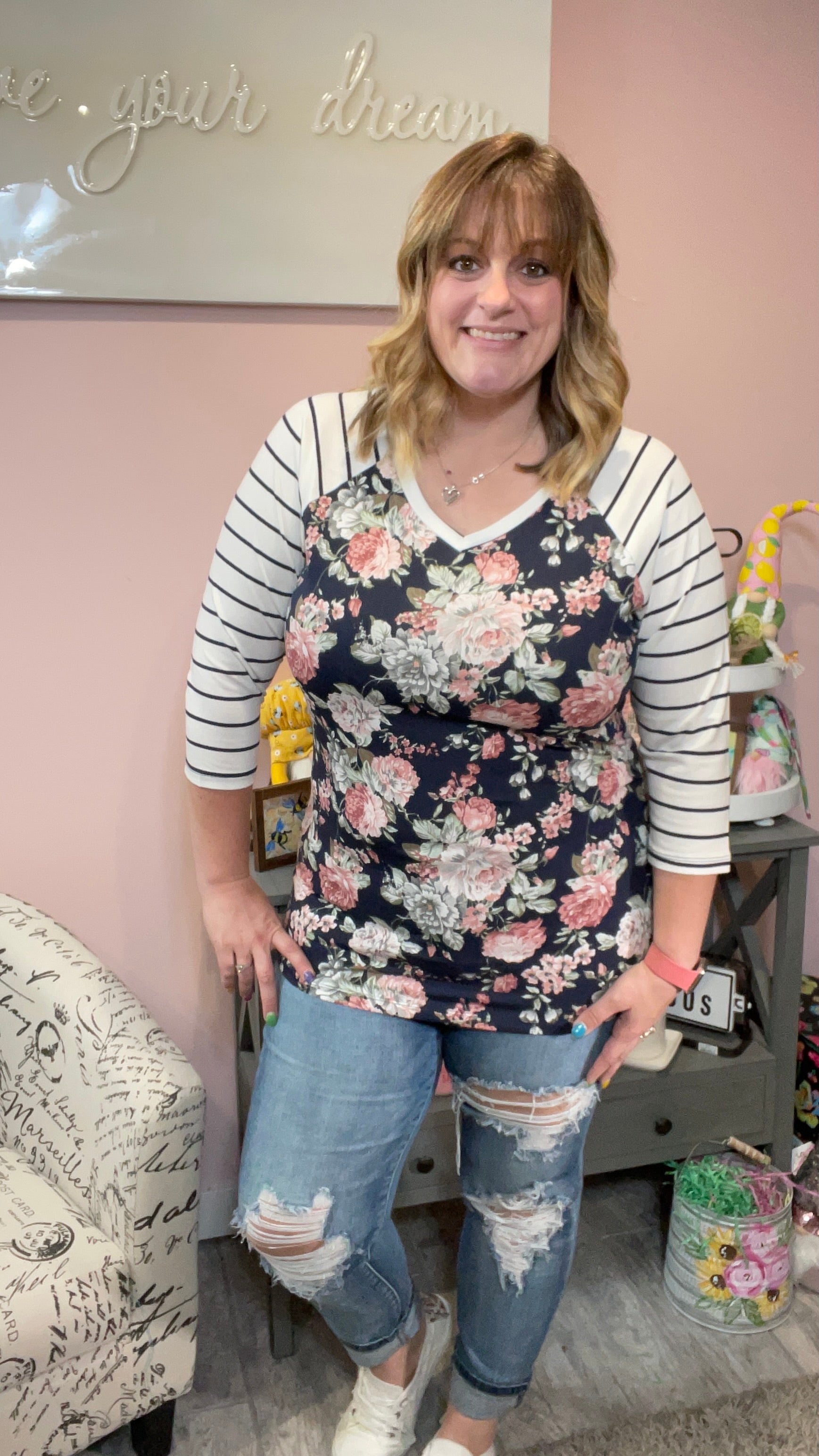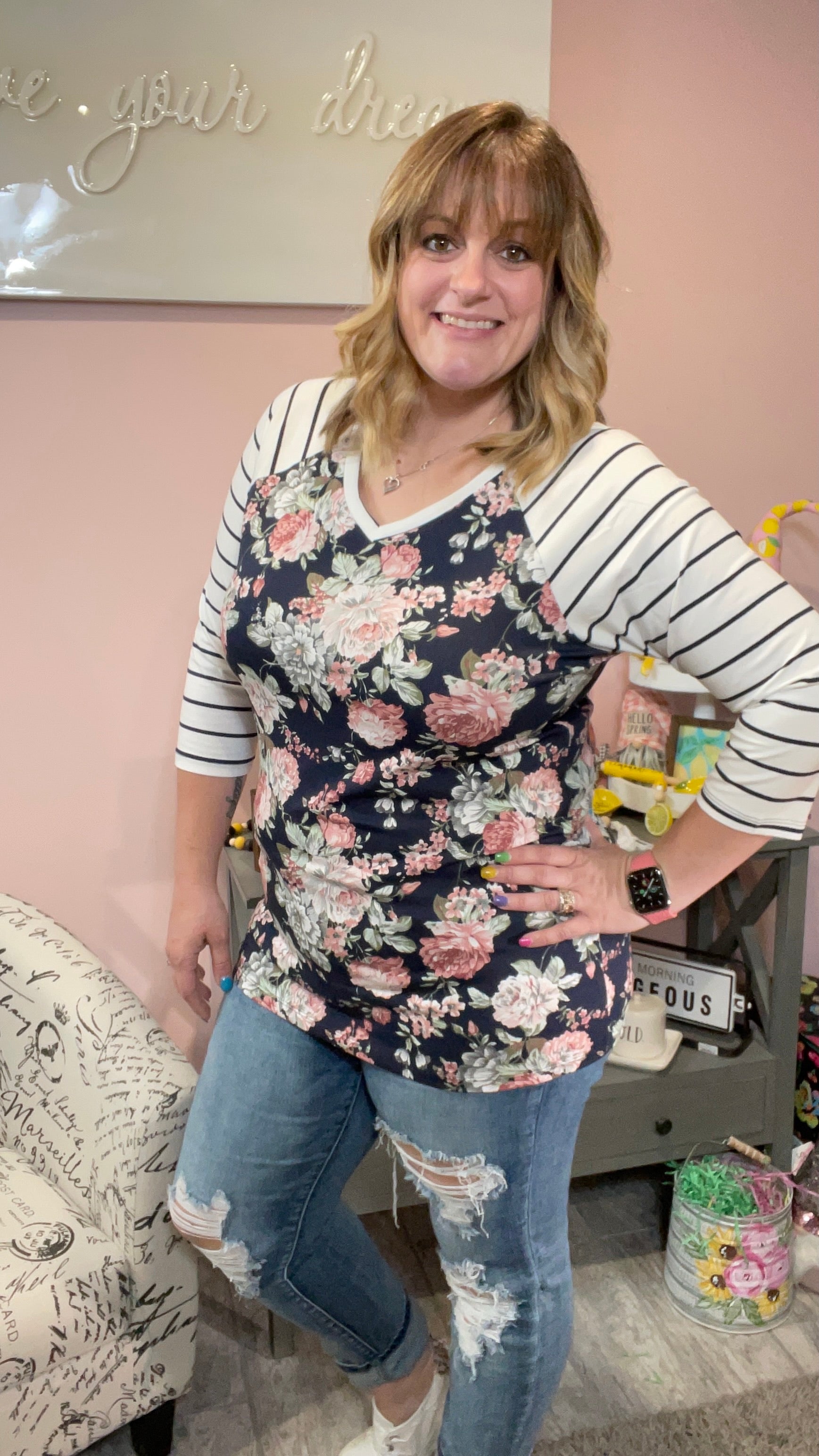 Classic 3/4 sleeve with a v-neck and the perfect pattern mixing of navy floral sleeves and white with navy stripes! The v-neck will be slightly deeper (more traditional v-neck) on the final versions. Runs true to size, lightweight but not sheer, and very soft!
