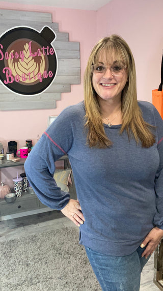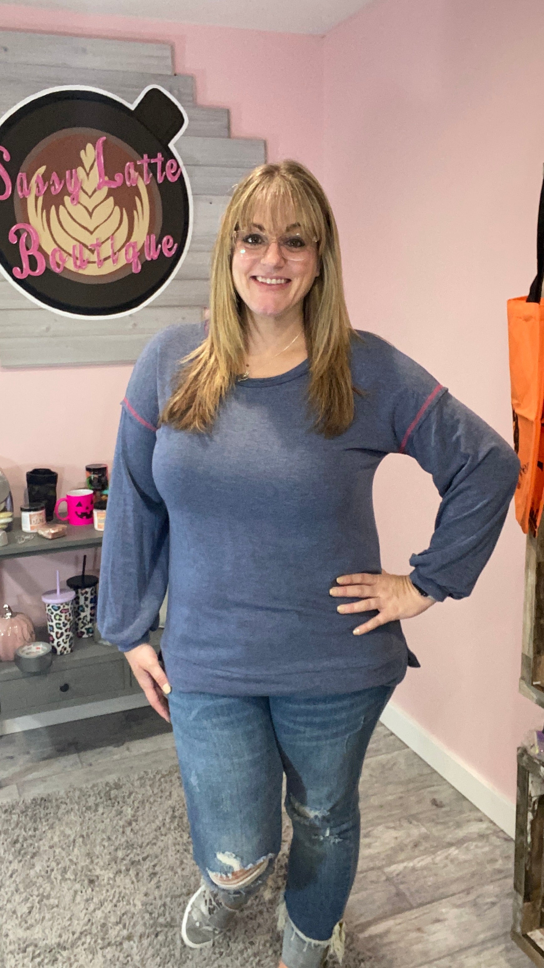 This is such a great staple sweatshirt. It is light weight and so comfy! And the navy color is perfect with that little pop of fuchsia on the stitching.