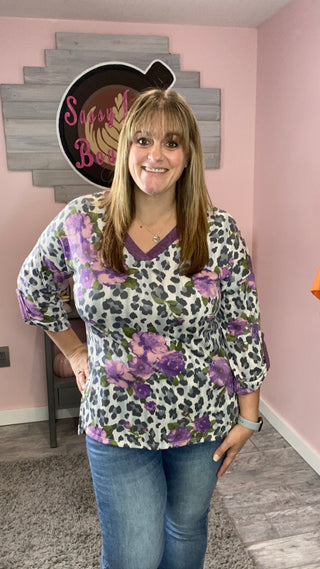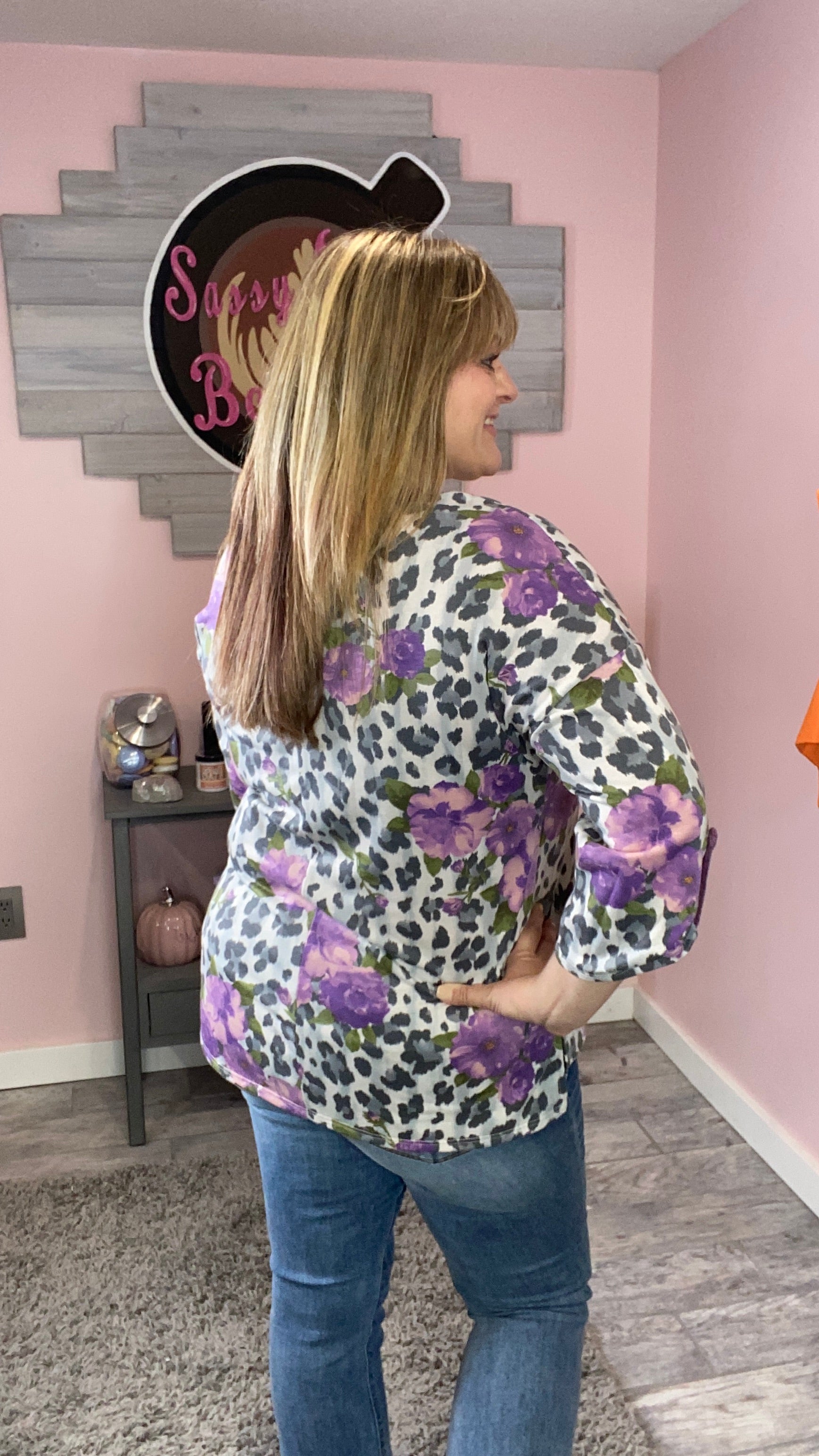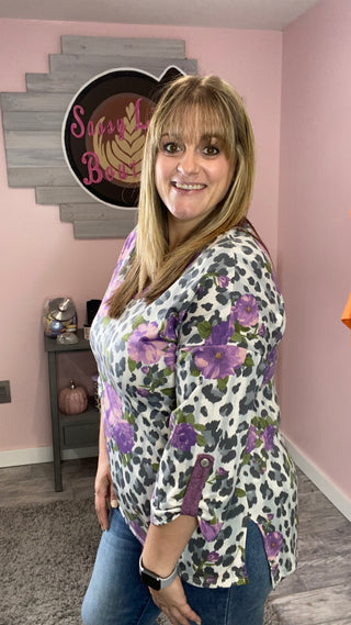 The purple floral with the animal print is on point! Then check out the sleeve button. This top is so sweet and fun!