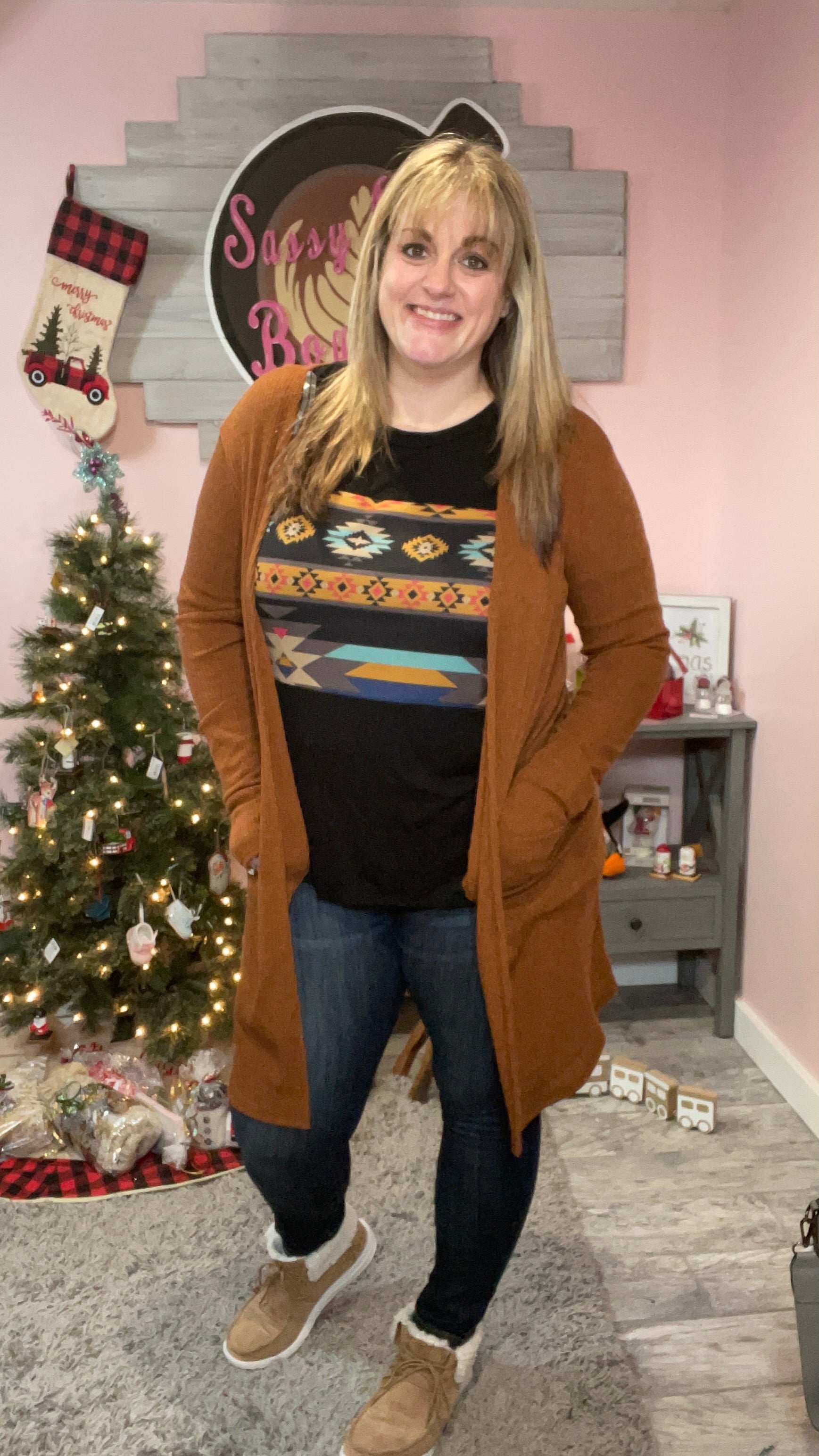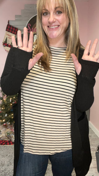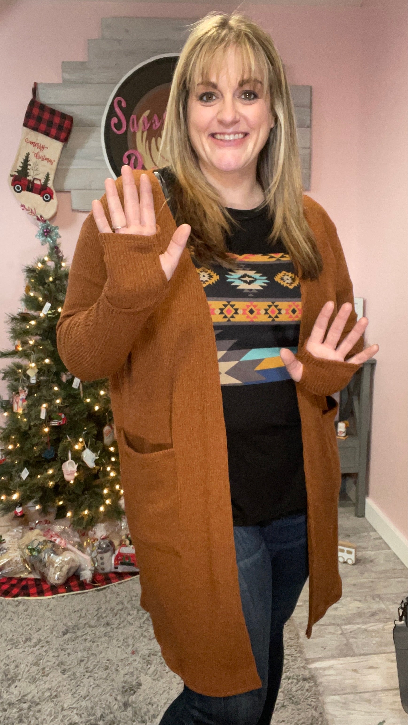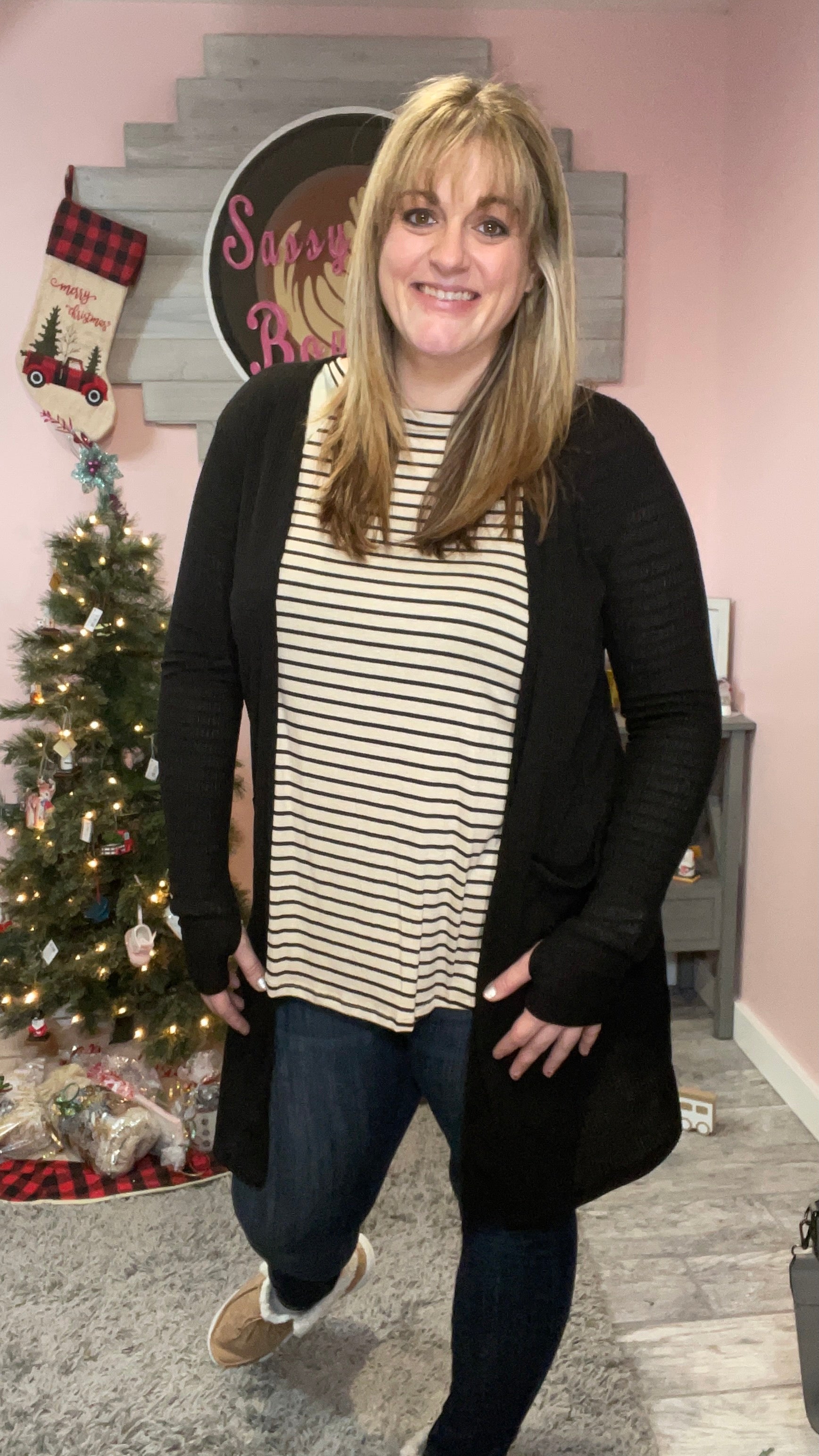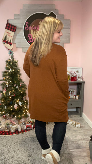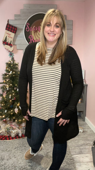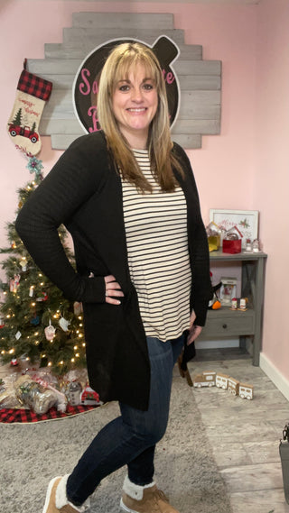 Perfect ribbed cardigans that feature over-sized side pockets and thumb-hole sleeves.