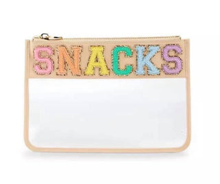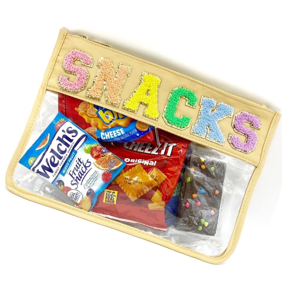 An Adorable clear flat pouch is great for organizing your SNACKS essentials when you're on the go.