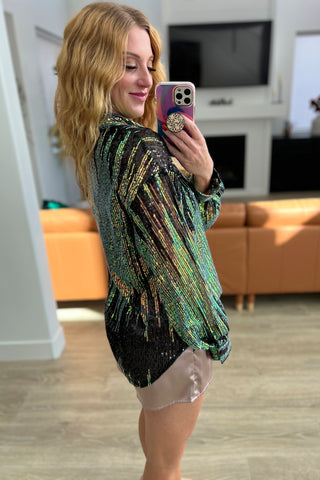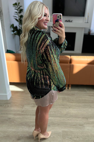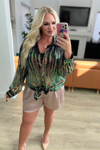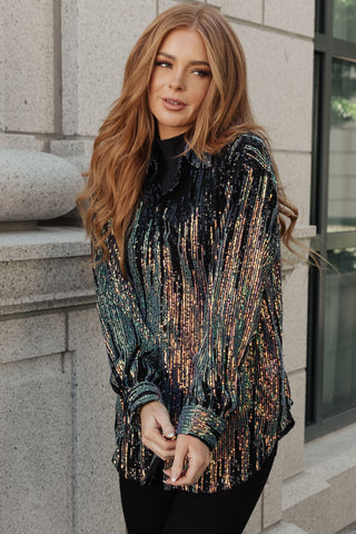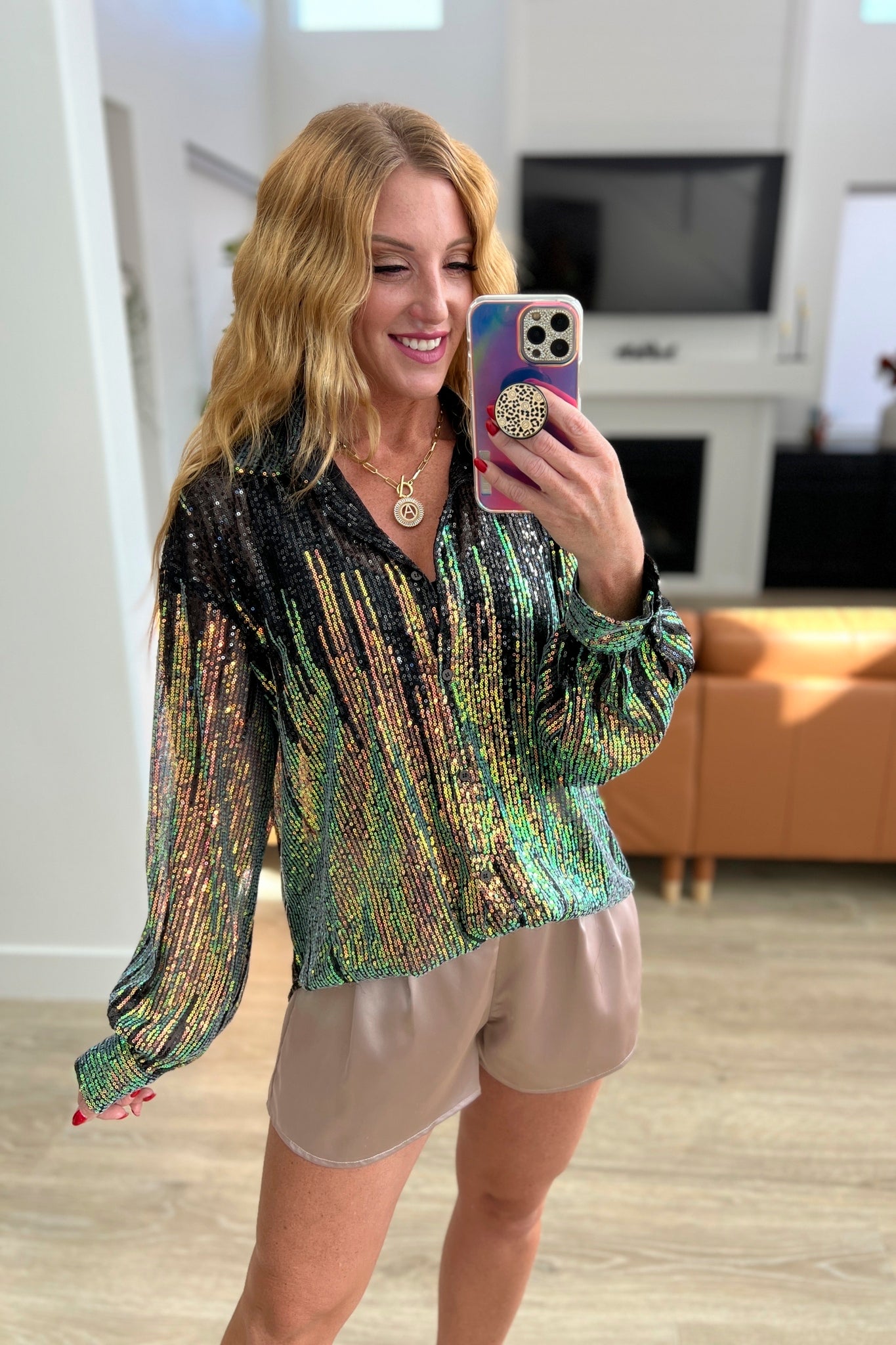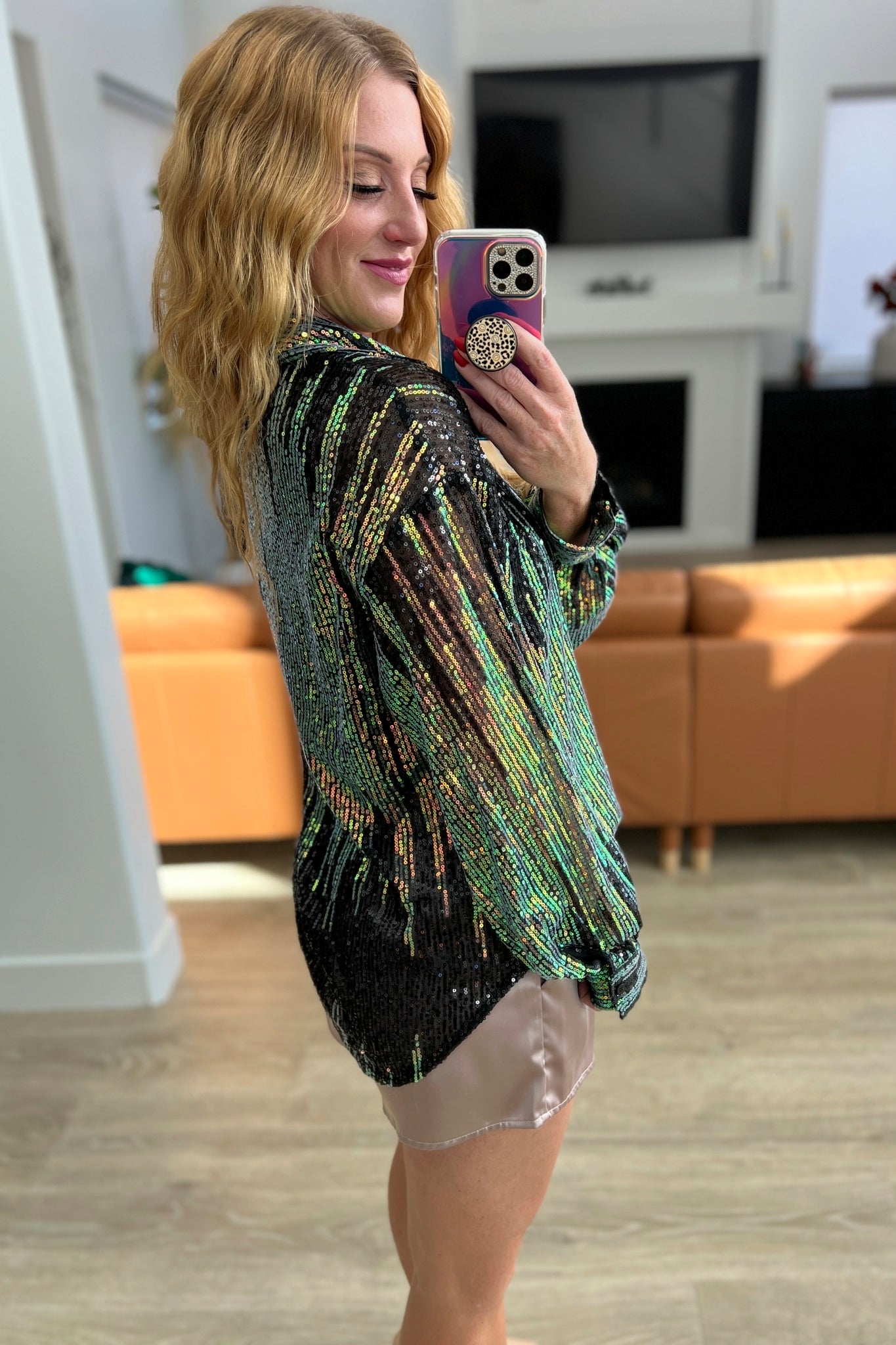 Be glamorous in this Too Glitz to Glam Button Up Shirt. Featuring a sheer sequin mesh, two tone sequins, collared neckline, and button front closure, this top will make you look dazzling. Enjoy the relaxed fit and button sleeve cuffs in style. Shine bright wherever you go!