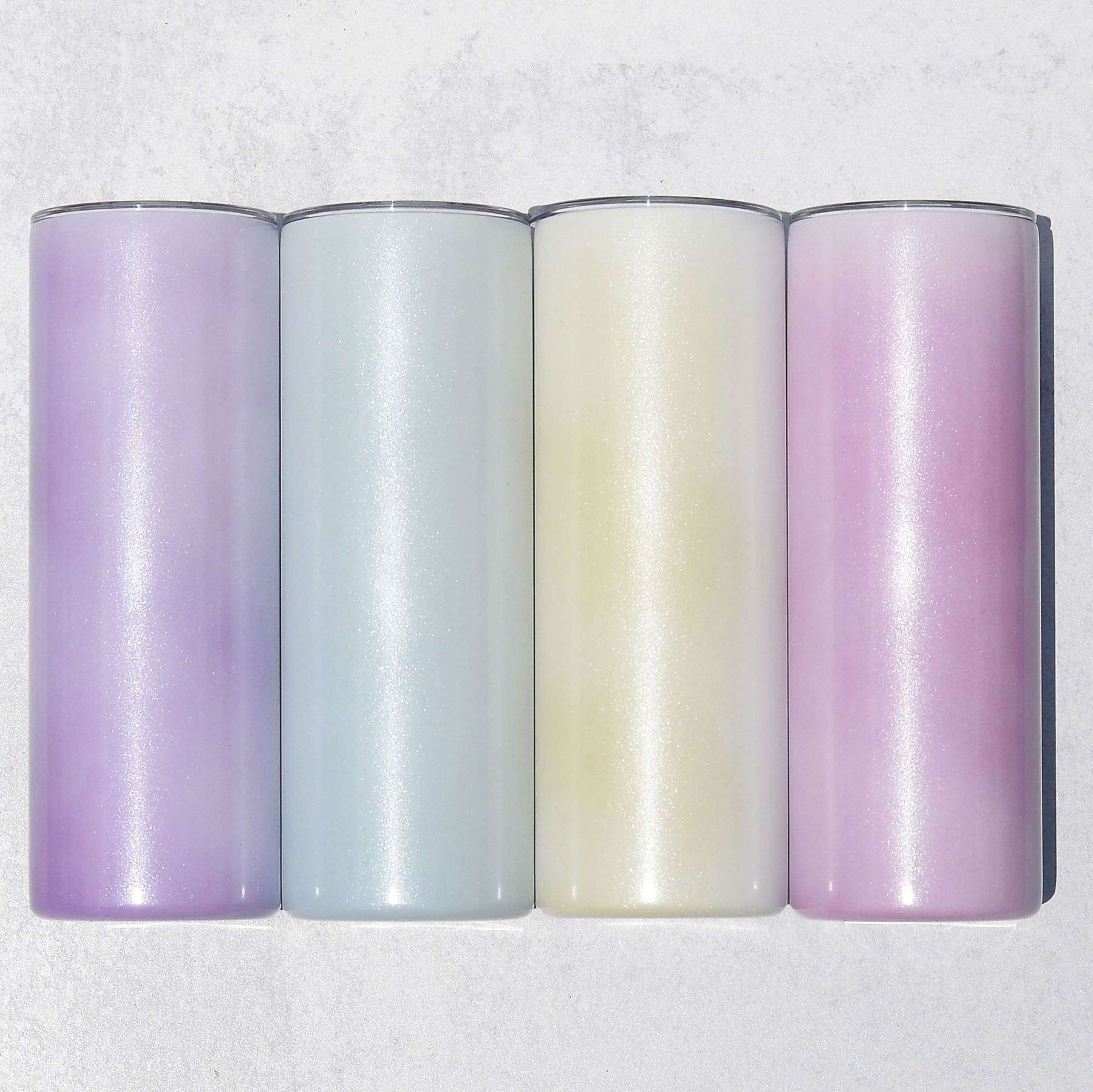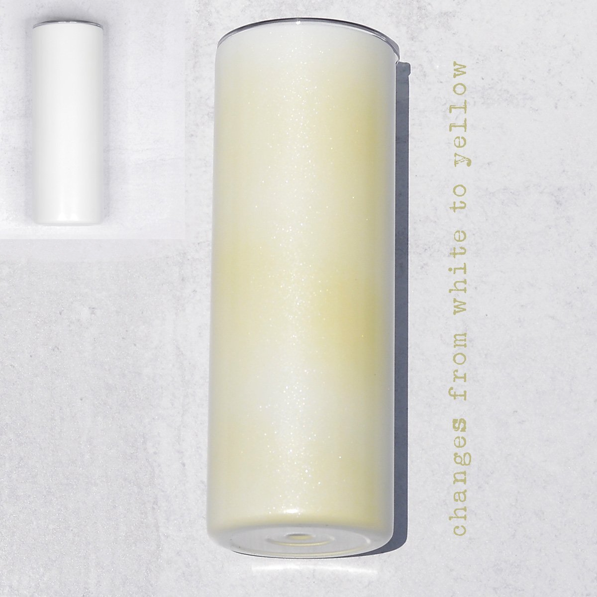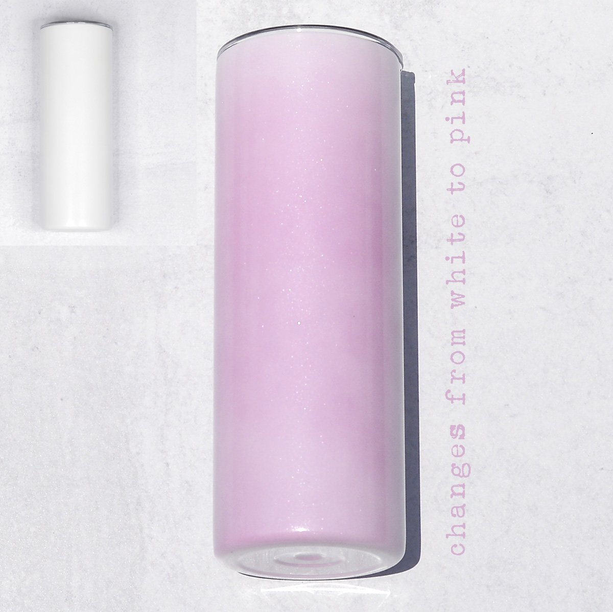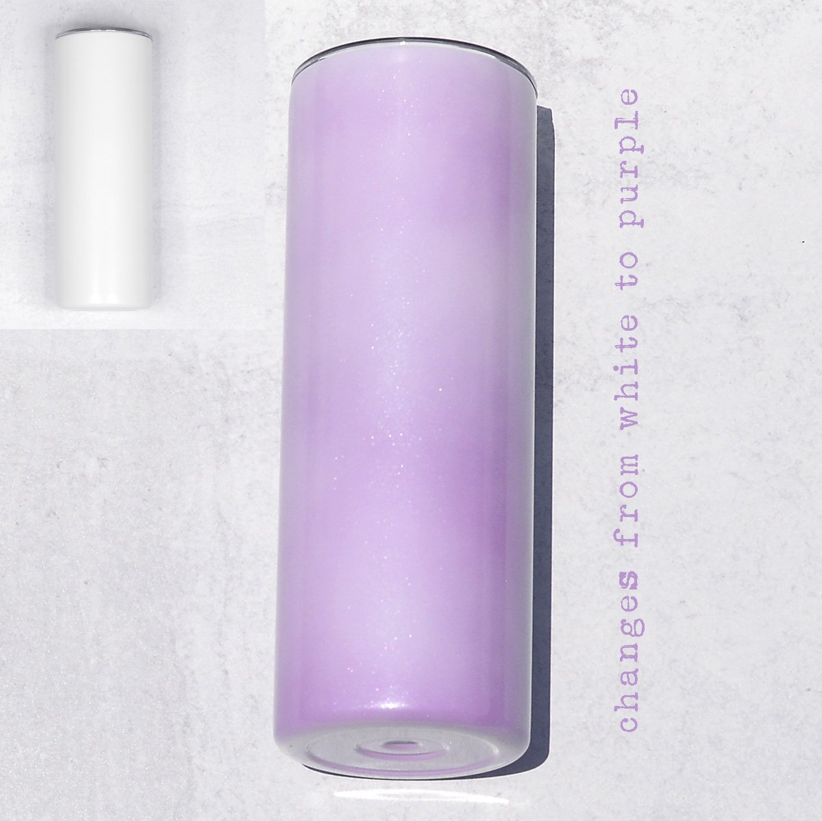 These tall travel cups are a fun and unique gift to show off in the sun with friends and family. Using UV light, these tall travel cups will change when placed in direct sunlight from white to color! They hold 20 oz of liquid, and come with a plastic straw. Do not microwave; top rack dishwasher safe (hand wash is recommended).