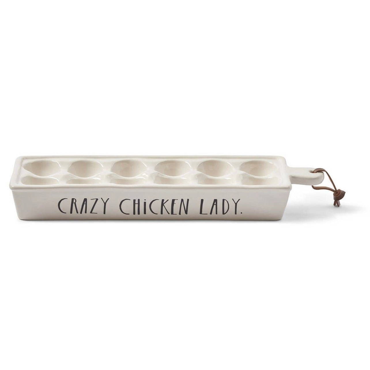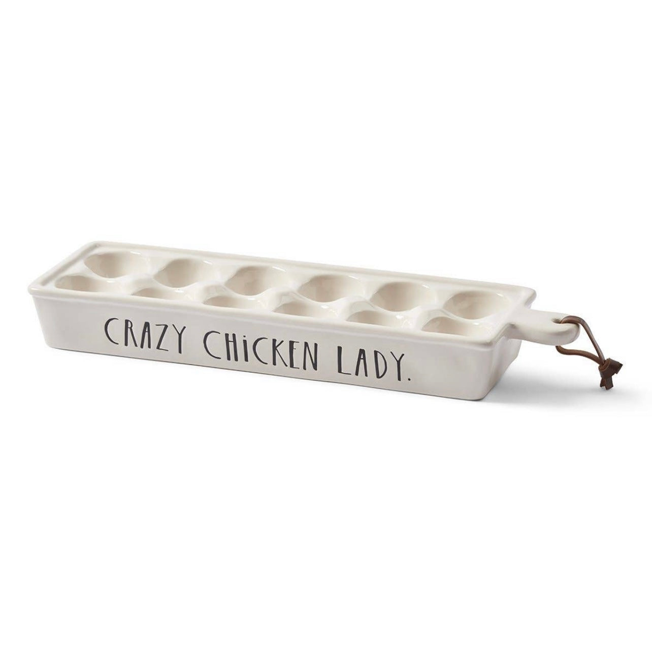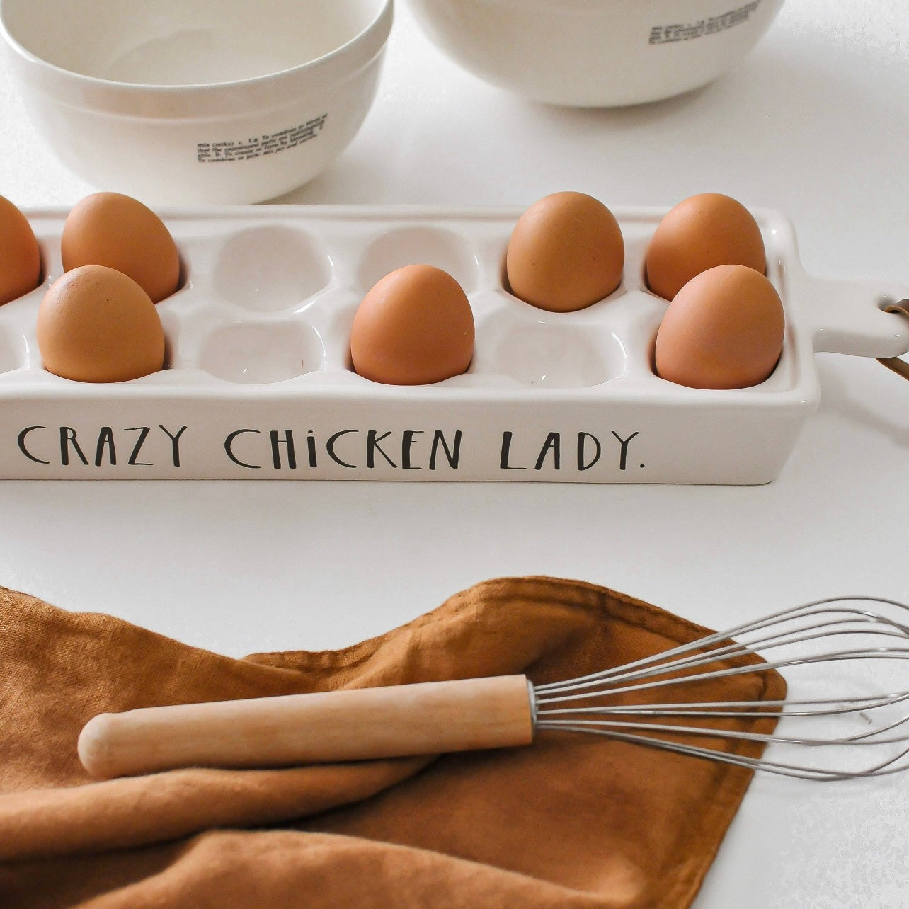Constructed after the classic cardboard carton form, Rae Dunn’s Ceramic Egg Crate neatly holds a dozen fresh eggs. Our quality egg tray safely stores eggs from the farmer's market or grocery store in your refrigerator effortlessly. The handle includes a leather loop to makes it easy to cart the crate around the kitchen when making breakfast or baking. Great for a particularly charming farmhouse breakfast or brunch presentation, use this tray to serve hard or soft-boiled eggs.