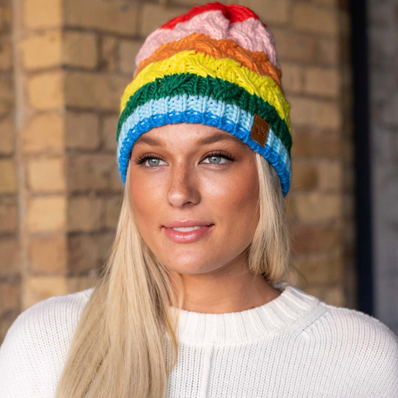Rainbow Stripe Cable Knit Fleece Lined Beanie
